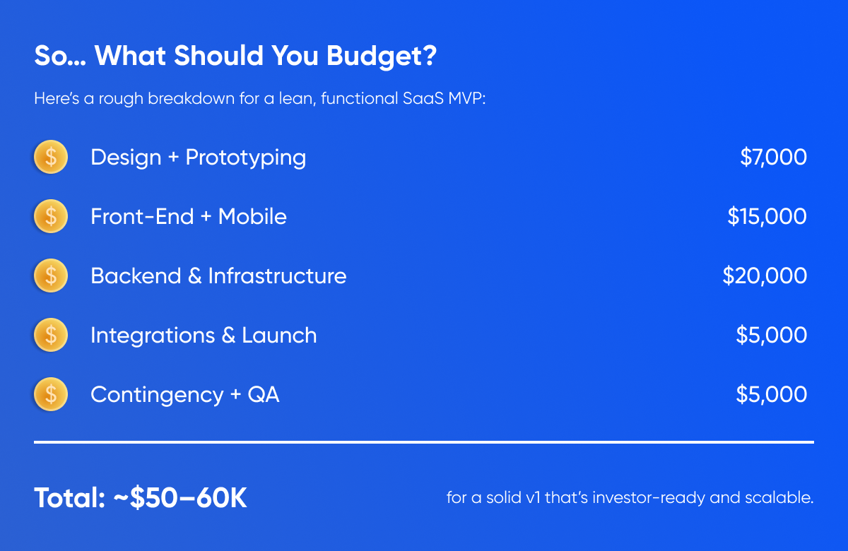 Trying to go cheaper than this often leads to unscalable, buggy products you’ll have to rebuild — and that will cost more down the line.