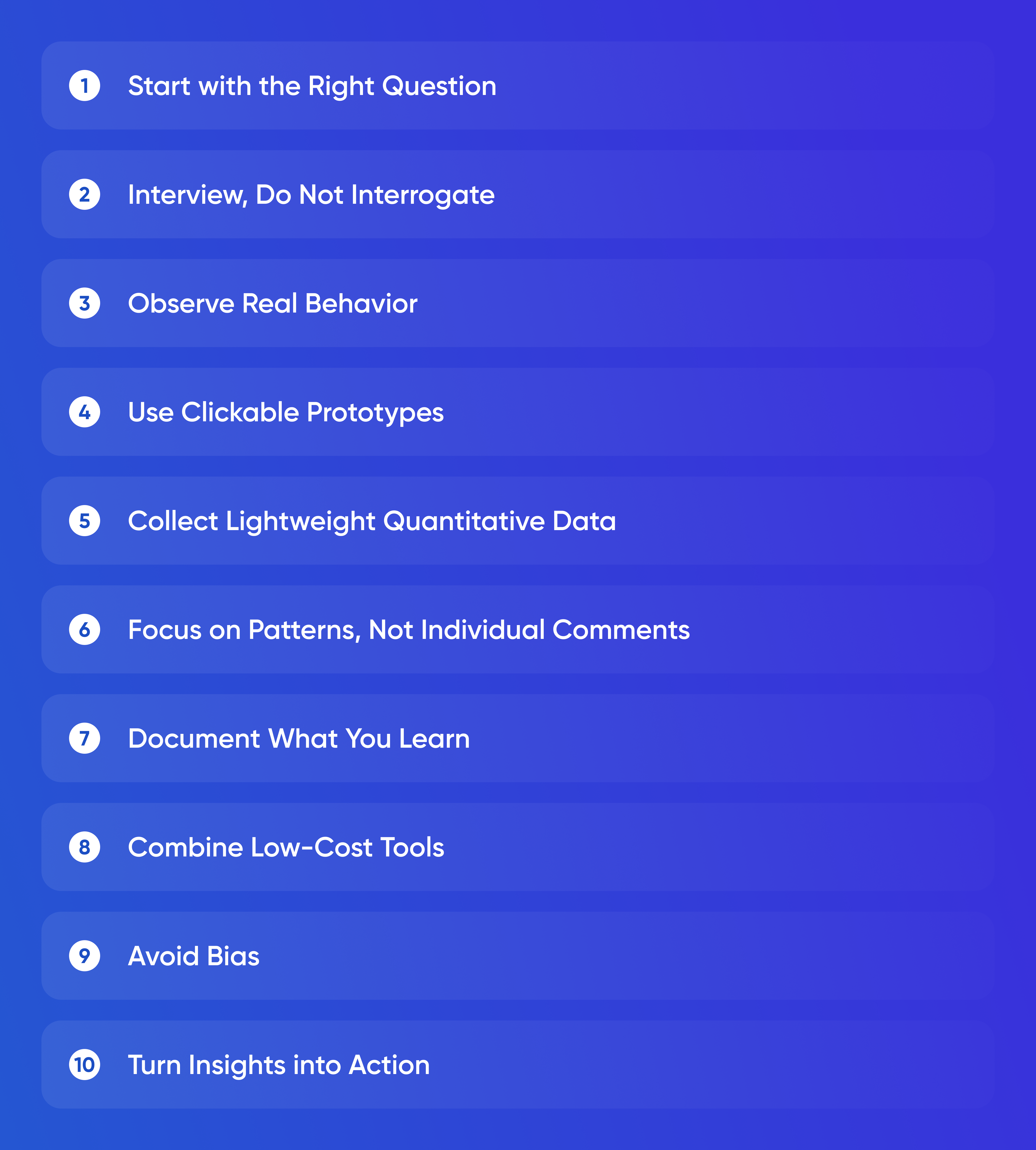 UX research on a tight budget depends on focus, honesty, and iteration. Start with a single question. Talk to real users. Watch them use the product. Write down what repeats and act on it. Expensive labs and large samples are not required to build something users love. What matters is your ability to listen, observe, and adapt faster than competitors who build blindly.